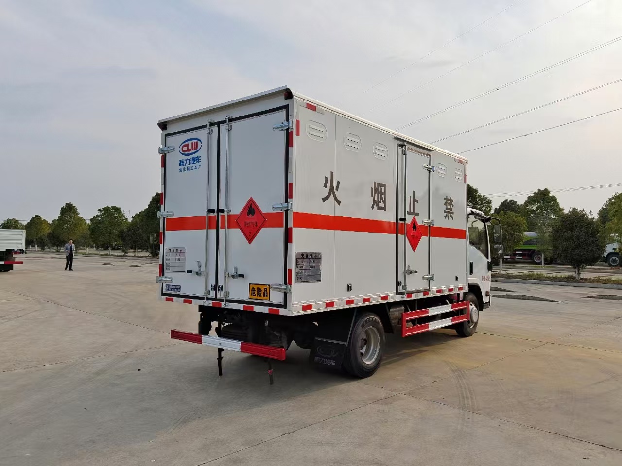 | 貨箱配置 | 廂體為雙層金屬骨架結(jié)構(gòu),外板采用冷軋鋼板,中間填充阻燃泡沫,內(nèi)飾為鋁板。底板為平板上鋪防靜電膠皮。廂內(nèi)兩側(cè)加裝固定貨物臥環(huán),門框帶防盜報警器,頂部帶煙霧報警器,廂體右側(cè)選裝側(cè)門,隨車配2個滅火器,危險標志牌,防火帽,危險品三角頂燈。(選裝瓦楞板貨箱) (尾部可選裝液壓升降尾板) | ||