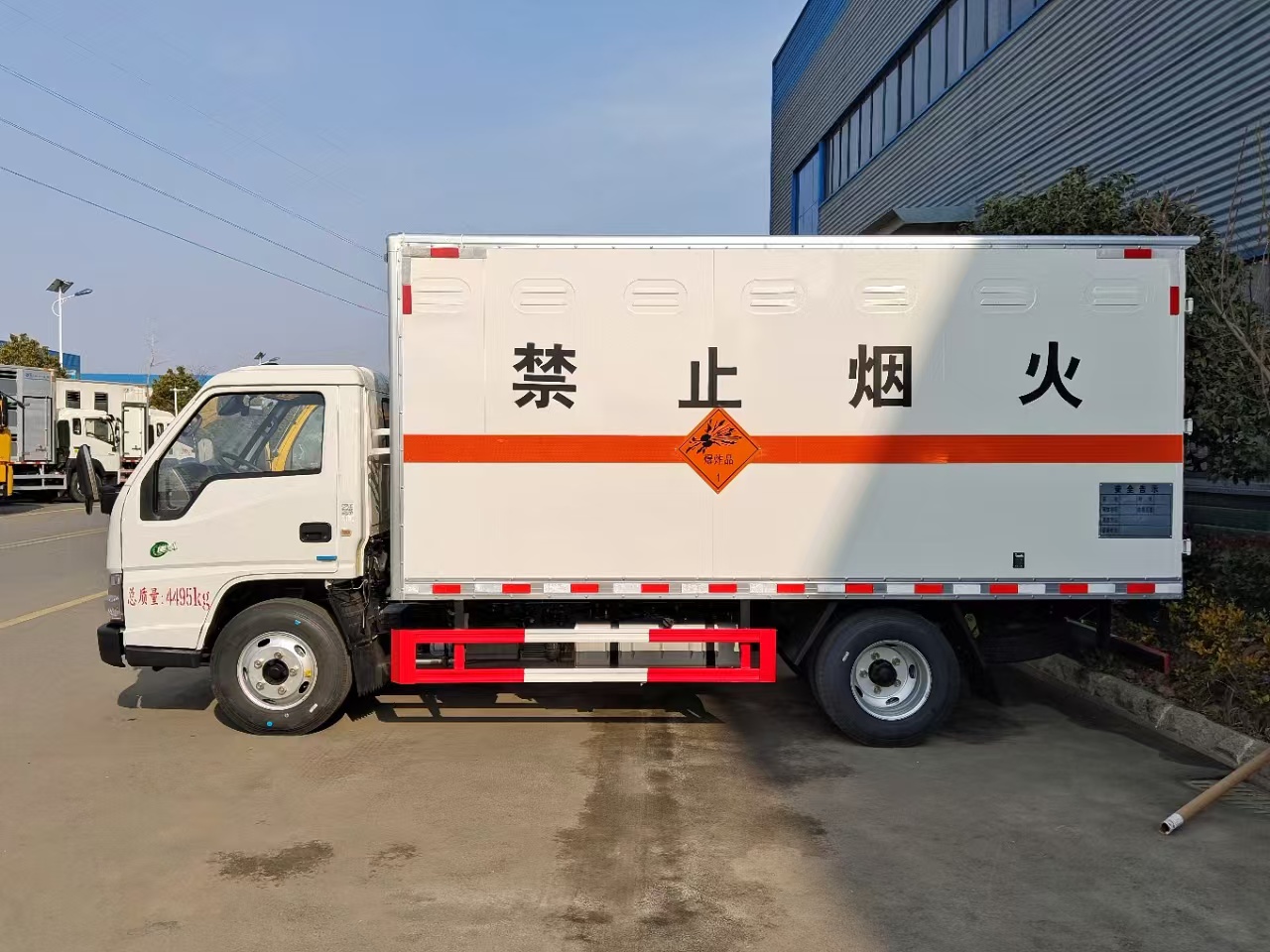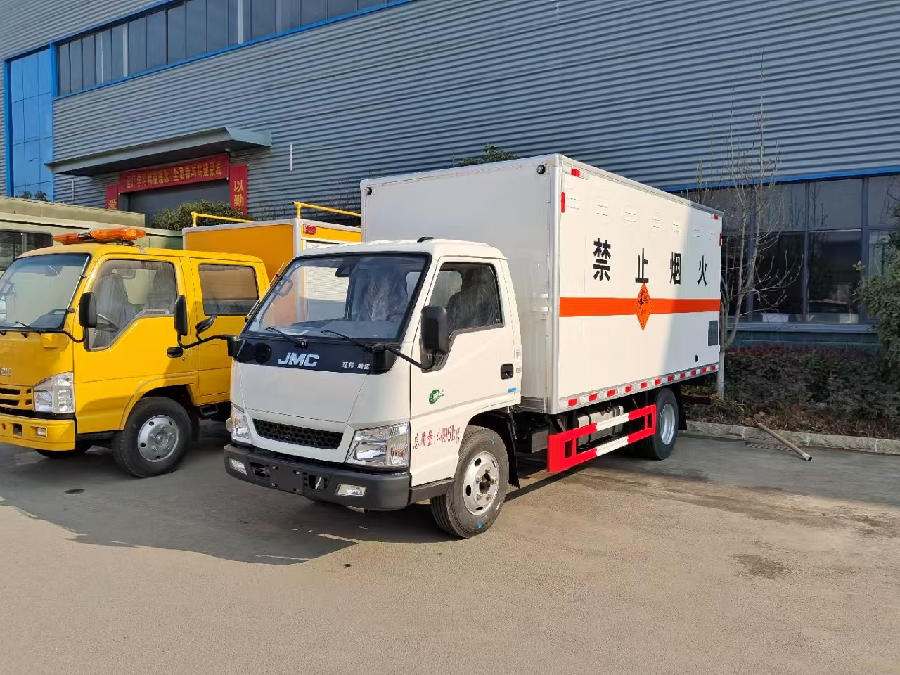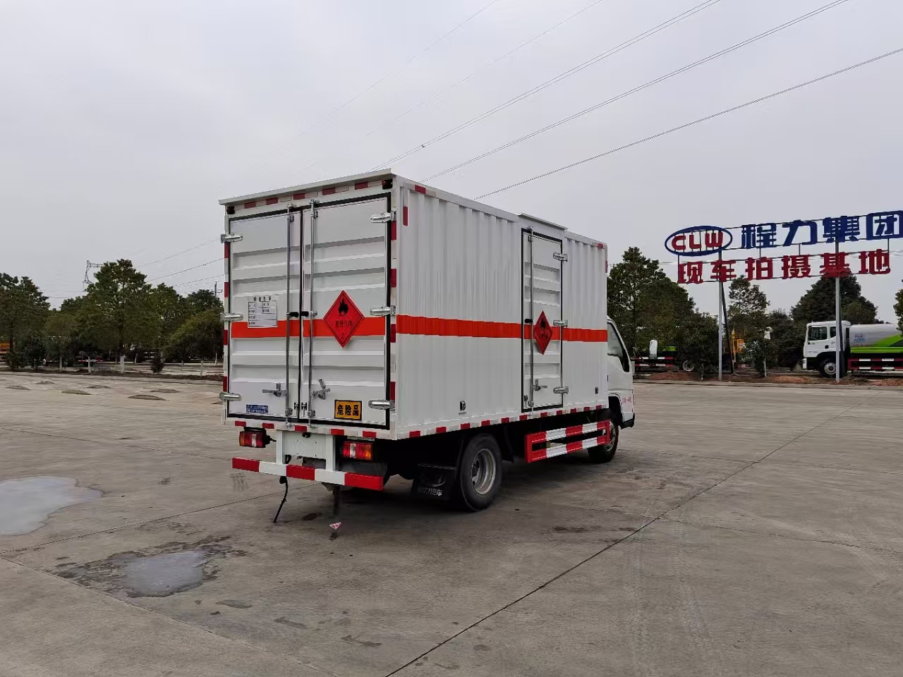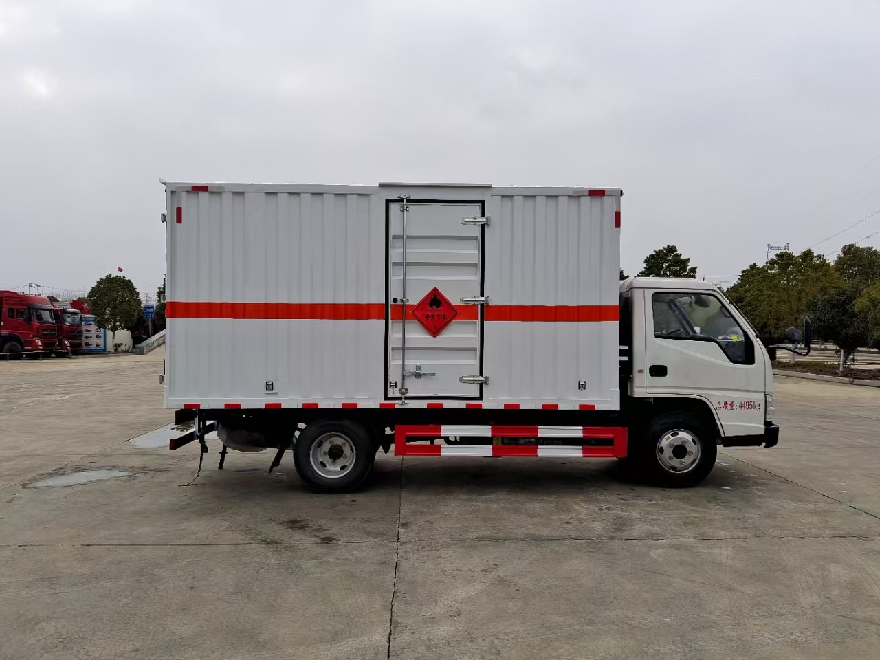 | 貨箱配置 | 廂體為雙層金屬骨架結構,外板采用冷軋鋼板,中間填充阻燃泡沫,內飾為鋁板。底板為平板上鋪防靜電膠皮。廂內兩側加裝固定貨物臥環(huán),門框帶防盜報警器,頂部帶煙霧報警器,廂體右側選裝側門,隨車配2個滅火器,危險標志牌,防火帽,危險品三角頂燈。 | ||